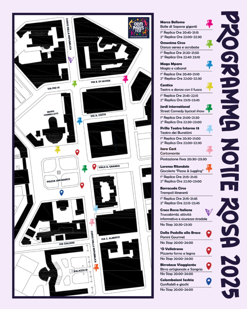 Venerdì 18 luglio 2025, il cuore di Latina si trasformerà in un palcoscenico di luci, colori e emozioni con la terza edizione della Notte Rosa, con Olim Palus Festival di artisti di strada Città di Latina. Un evento imperdibile che invaderà le vie del centro, da Palazzo M passando per Piazza San Marco fino all’isola pedonale, regalando una serata all’insegna del divertimento e della meraviglia. Saranno 8 le postazioni fisse degli artisti di strada che dalle 20:30 alle 24:00 si alterneranno in esibizioni nuove e travolgenti: giocolieri, equilibristi, trampolieri, spettacoli con il fuoco e bolle giganti animeranno le nostre strade, creando un’atmosfera unica e coinvolgente per grandi e piccini. L’evento organizzato dalla Pro Loco di Latina Centro Lido, rappresenta un’occasione speciale per le famiglie e i bambini di vivere momenti di allegria e stupore, contribuendo a rendere le sere estive a Latina ancora più vivaci e memorabili.