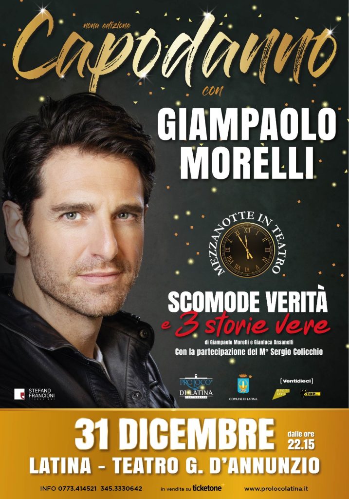 Giunge alla nona edizione il Capodanno a Latina, organizzato dalla Pro Loco di Latina in collaborazione con Ventidieci, Top Agency e Berti Live, domenica 31 dicembre, al Teatro D’Annunzio con lo spettacolo di Giampaolo Morelli, “Scomode verità e 3 storie vere”, di Giampaolo Morelli e Gianluca Ansanelli, con la partecipazione del M° Sergio Colicchio. Mezzanotte in teatro con brindisi nel foyer. “Scomode verità e 3 storie vere”, è il comedy speech attraverso cui Giampaolo Morelli si racconta al suo pubblico: un monologo irriverente, caustico, pungente e sempre maledettamente sincero. Le 101 scomode verità, infatti, altro non sono che un sunto delle nostre umane debolezze, un compendio di tutti i tic, le manie, gli slanci e le ossessioni del nostro vivere quotidiano. A volte si tratta di fulminanti considerazioni, quasi degli aforismi in grado di fotografare la realtà sotto una luce nuova o paradossale, altre volte invece le riflessioni si fanno più discorsive e articolate o magari intime e profonde: come nel caso delle 3 storie personali citate nel titolo, ovvero tre aneddoti di vita vissuta che offrono al pubblico un ritratto inedito e confidenziale del noto attore.